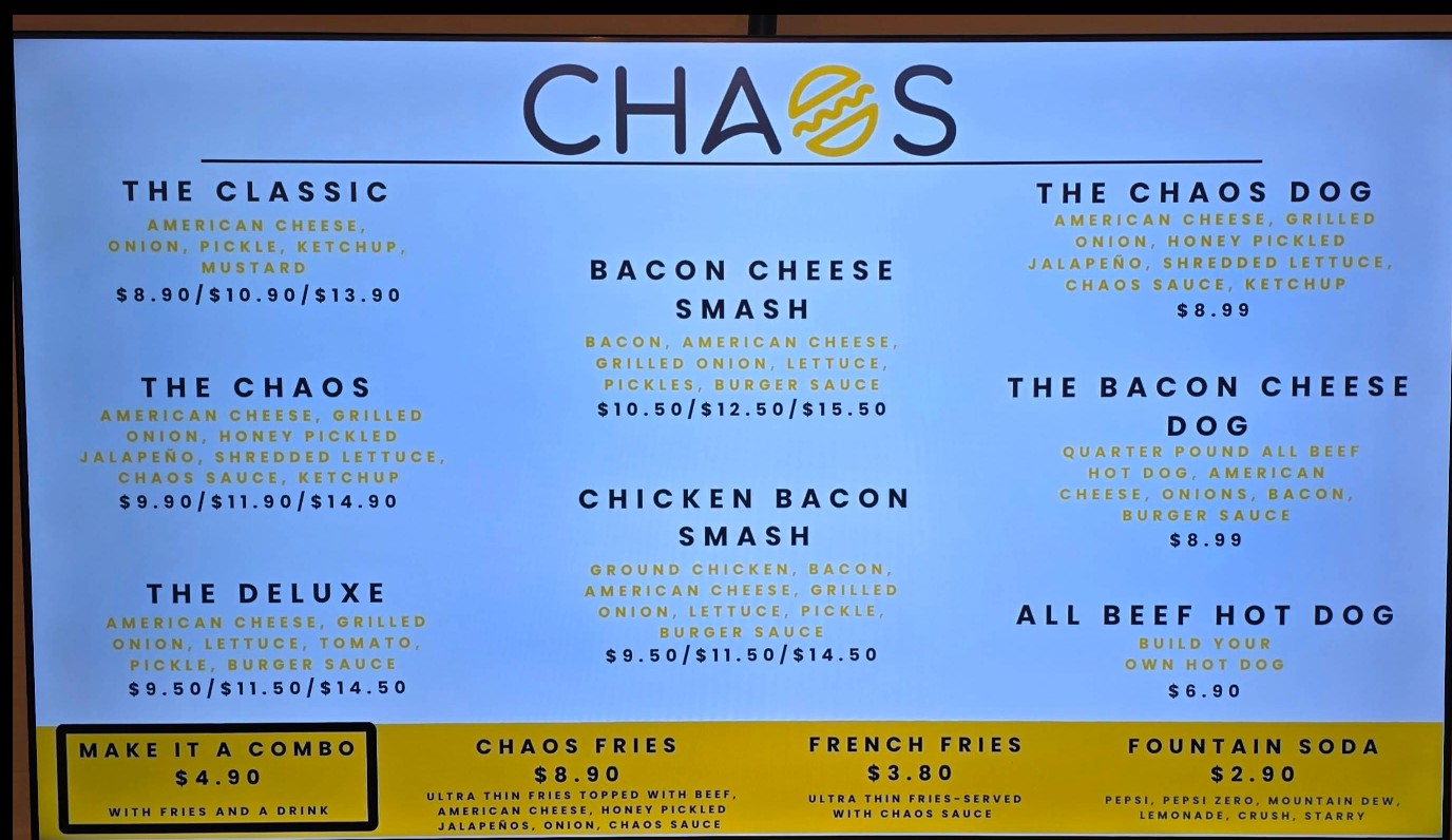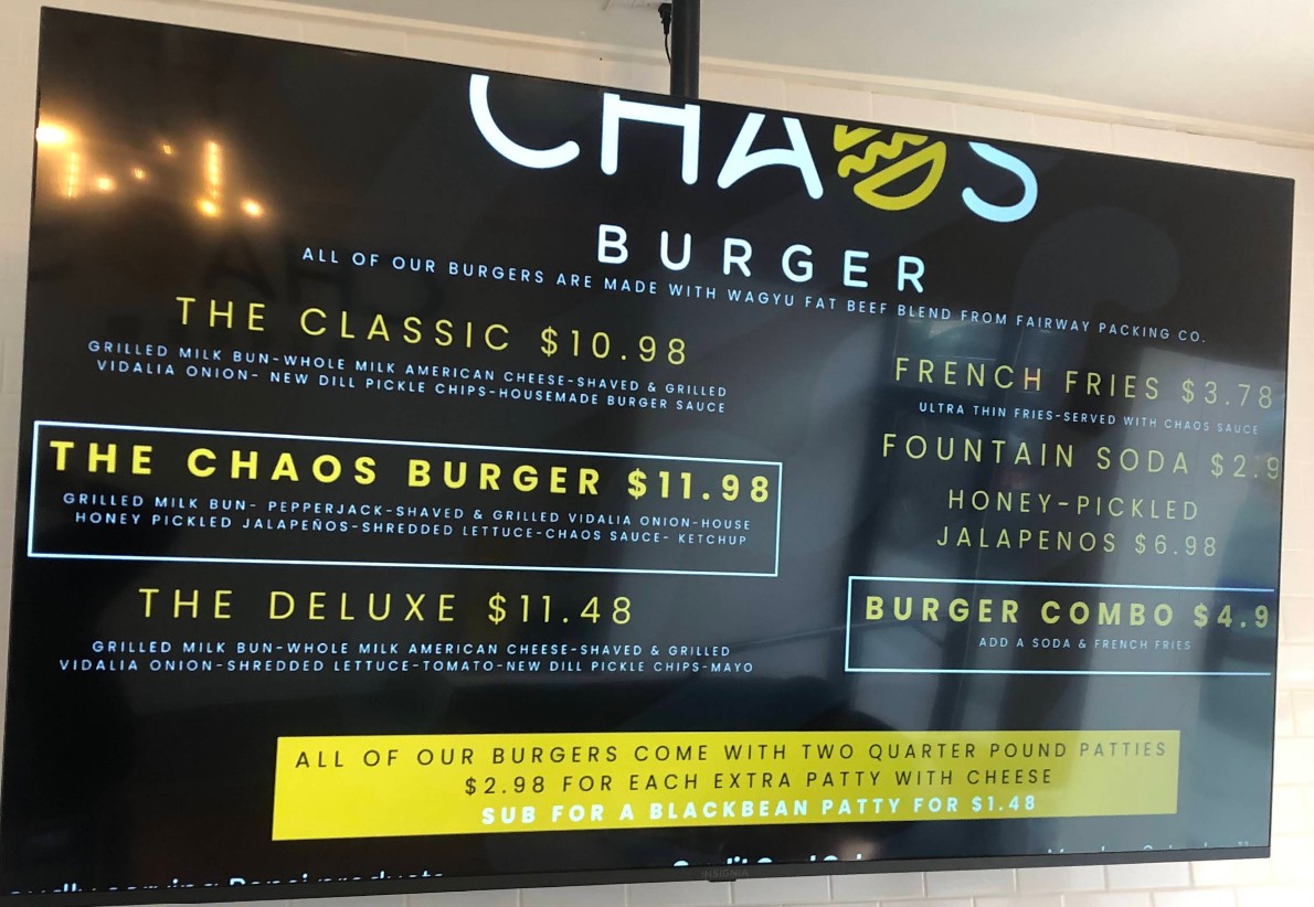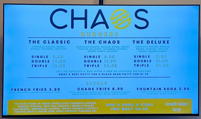Who doesn't enjoy a bit of chaos? 🤓 Popped in here after seeing a sign around the corner and we weren't disappointed. The namesake burger (double) hit the spot. I had a bite of the chicken bacon burger and that was cooked perfectly as well. The kids loved the string fries with both the ketchup and special sauce.